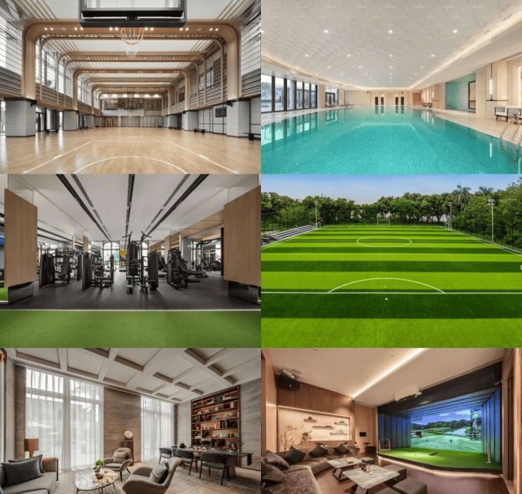 内部有开放式开敞明亮的图书馆、室内外儿童乐园、室外花园泳池、室内恒温泳池、室内多功能综合球馆、乒乓球室、健身房、虚拟高尔夫、茶室等设施场地,以会员制打造自然健康圈层生活平台。
