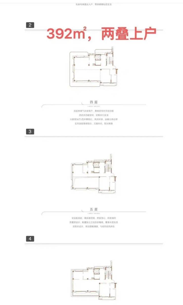 ①其中,两叠的上叠面积为392㎡,花园面积区间约为123-298㎡,天台面积约为93㎡,实用率193-259%;