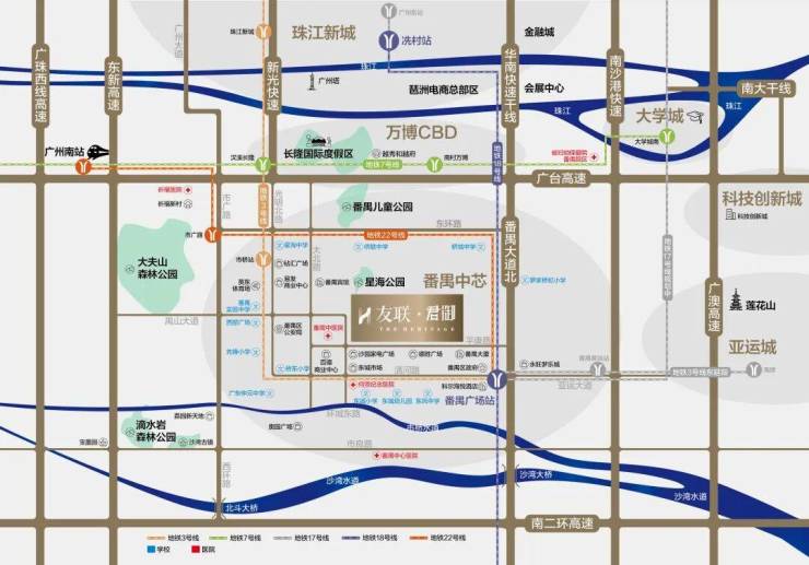 项目坐拥番禺TOD交通枢纽,地铁3号线、17号线(规划中)、18号线、22号线四轨接驳,湾区最快地铁18号线,时速可达160公里,一站直达天河,占位交通便捷之处,让工作与生活的切换更便利。