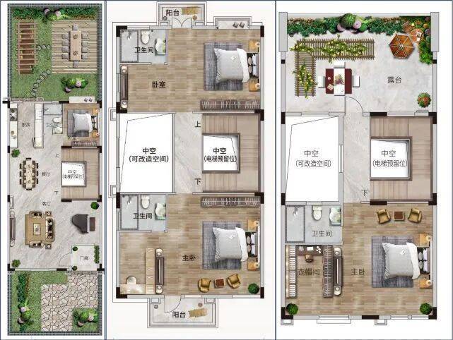 四联二层半,建筑基底卙地约100㎡,6.6米开间客厅面积:65㎡,双主套设计带约67-125㎡超大花园露台+中空赠送面积约50㎡