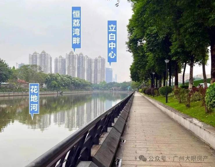 项目北侧是花地河,直线距离约50米,仅仅隔了一条花海街和绿道。