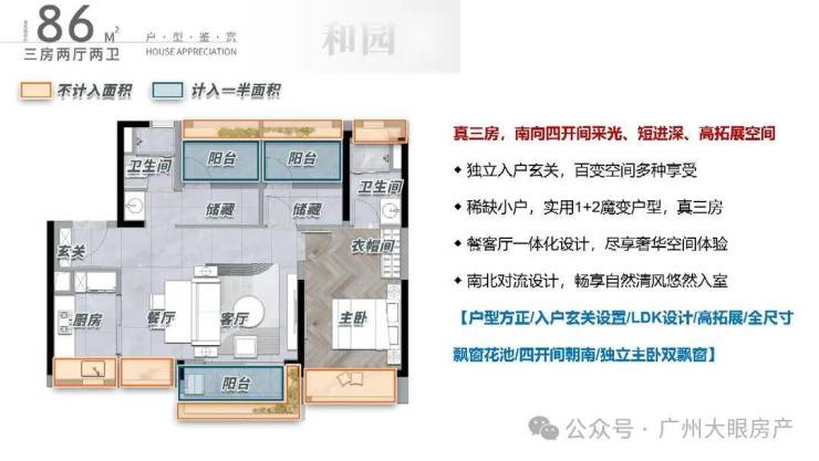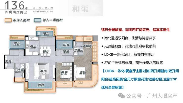 142方,2梯2户+独梯入户的设计,将私密性拉满,厅出阳台即是花地河水景,双主卧大面积+8.5m宽景阳台的设计满足多使用场景,北阳台可望花地河水景,南飘窗可望园林,景色全览。