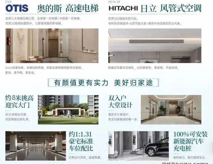 项目以豪宅标准,匠心打造8cm厚装甲门+四合一智能门锁、采用高配门窗、120系列新标重型推拉门、西门子开关面板等精工匠造。筑就约8米高的入口门楼、双入户大堂设计,奢华石材铺装媲美五星级酒店的归家体验。臻享顶豪同款配置地下车库,1:131超高车位比。电梯采用的是全球排名前列的奥的斯高速电梯、引进淋浴界的爱马仕——德国汉斯格雅洁具、卫浴界的劳斯莱斯——杜拉维特卫浴,国际品牌联袂,筑就“豪宅式”人居新典范。