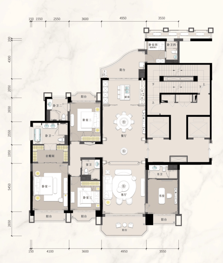 以约 236㎡的 A3 星盈淡雅户型为例,五房三厅五卫的设计,空间布局合理,功能齐全。南北通透的设计,让室内空气流通顺畅,同时奢享江城园景。