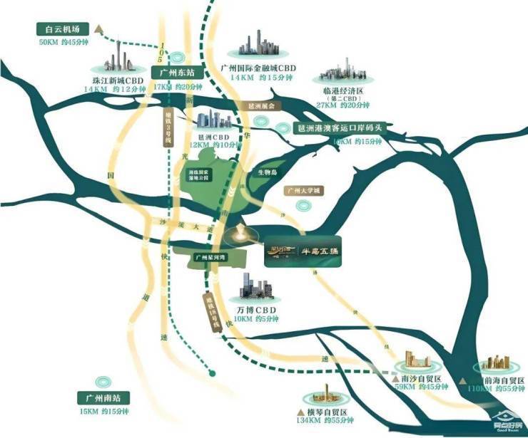 星河湾半岛五号位于番禺洛溪岛东端的岛尖位置,这个区域有着景观优势。它地处海上丝绸之路的源点,北望万亩果林、CBD 双塔,还能远眺白云山,南面与广州星河湾隔江相望,东北面与大学城及黄埔古港相邻。更值得一提的是,项目东、南、北三面均被宽阔的珠江环绕,江面最宽处达 1200 米,是广州规划的城市中心“中央居住区”,能让业主独享三重景观,将江景、山景、城市景尽收眼底。