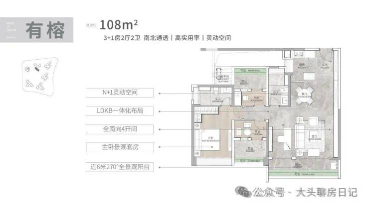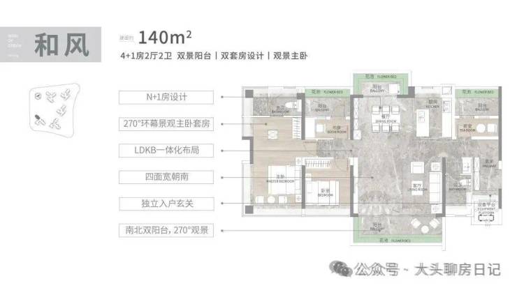 5、’户型设计出色:有多种户型可供选择,如建面约110㎡户型,南向阳台近6米,显得很阔气,还有270°视野,ldkb一体化设计,形成阔绰方厅;建面约129㎡听山户型,阳光玄关设计兼顾户内私密性和储物空间,符合广东地区对风水的理解;建面约140㎡的户型,居住空间进一步拓展,主卧做到了三面采光,将观景角度扩大到270°;建面约165㎡大户型,朝南面宽达到约17.4米、近9米l型景观阳台、大方厅设计。