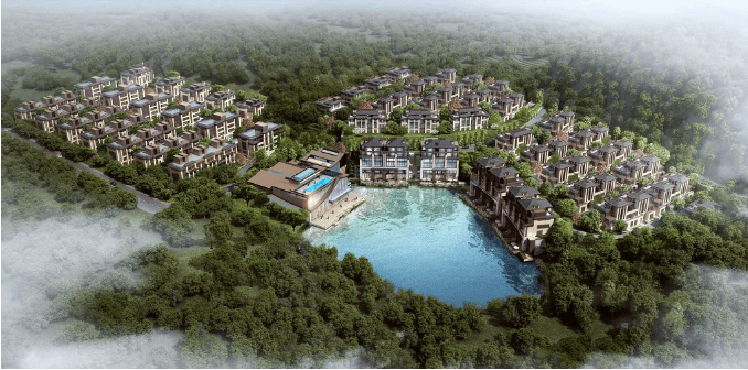 项目沿自然山脉地势而建,利用三面环山和地块落差的优势条件,采用“多台地”的布局,让每一栋视线不受遮挡,营造出背山靠湖的空间布局。