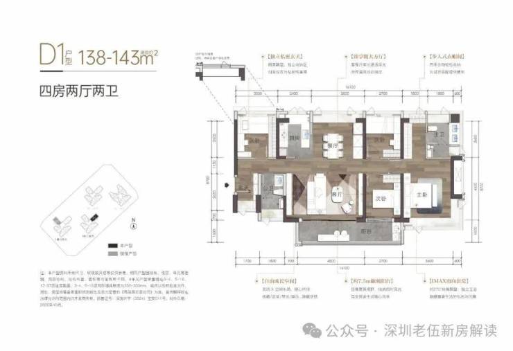 横厅设计,玄关宽敞收纳空间比较多,大面宽观景,通透无遮挡,L型厨房,客餐厅一体,主卧套房设计,约270°转角飘窗。