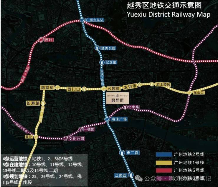 君熙府与地铁 1 号线和 2 号线的交汇点公园前站仅相距约 400 米,毗邻解放路与中山路,能快速接驳东风路和内环路等,可迅速抵达天河、海珠、荔湾等各区核心地带。