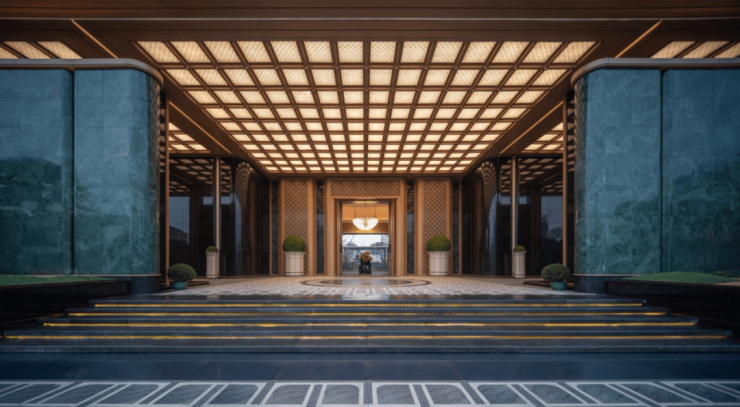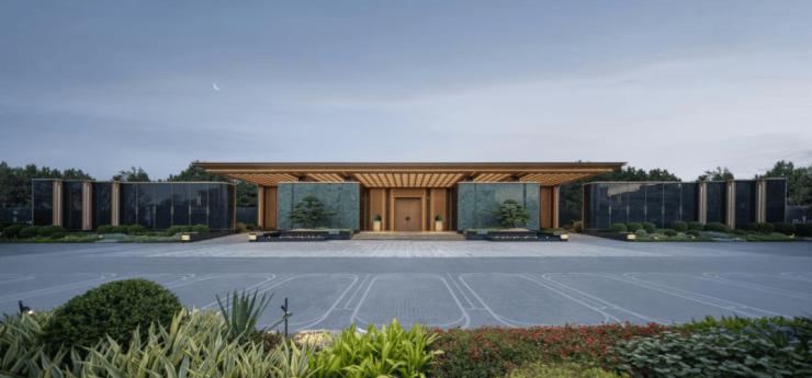 屹立于社区主入口、约88.8米宽的“广州门王”,这是一扇纯手工铜门,门上艺术格栅与宝格丽绿奢石相映,配合迎客松与白玉灯盘矩阵,让业主特别有排面。