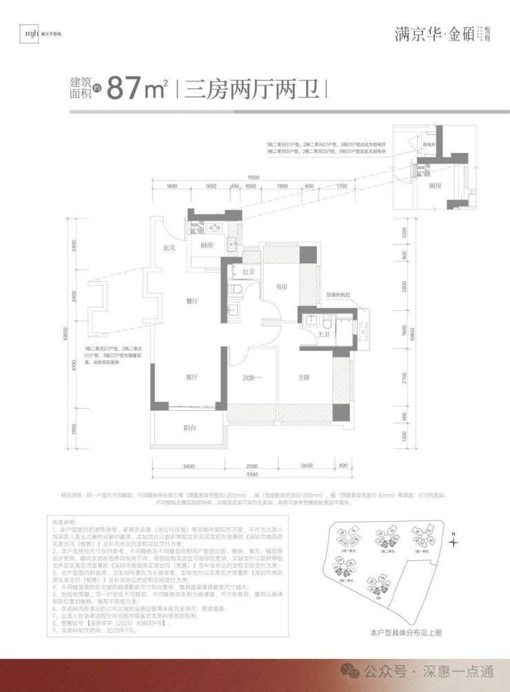 87㎡的3房2厅2卫,设计的是经典竖厅格局,客厅3.4米开间,LDKB一体化,S墙设计预留冰箱卡槽位,动静分区,三开间朝南,3房卧室分别做到了主卧13.33㎡/次卧8.75㎡/次卧8.54㎡(包含墙体飘窗),U型厨房,公卫三段式分离,得房率76.51-77.06%(不加赠送),阳台6.46㎡西南或东南朝向。套内面积66.72㎡+赠送面积14.57㎡=实得81.29㎡,加上赠送得房率93.89%。 满京华金硕悦府 售楼处 | 预约看房专线:400-832-8772