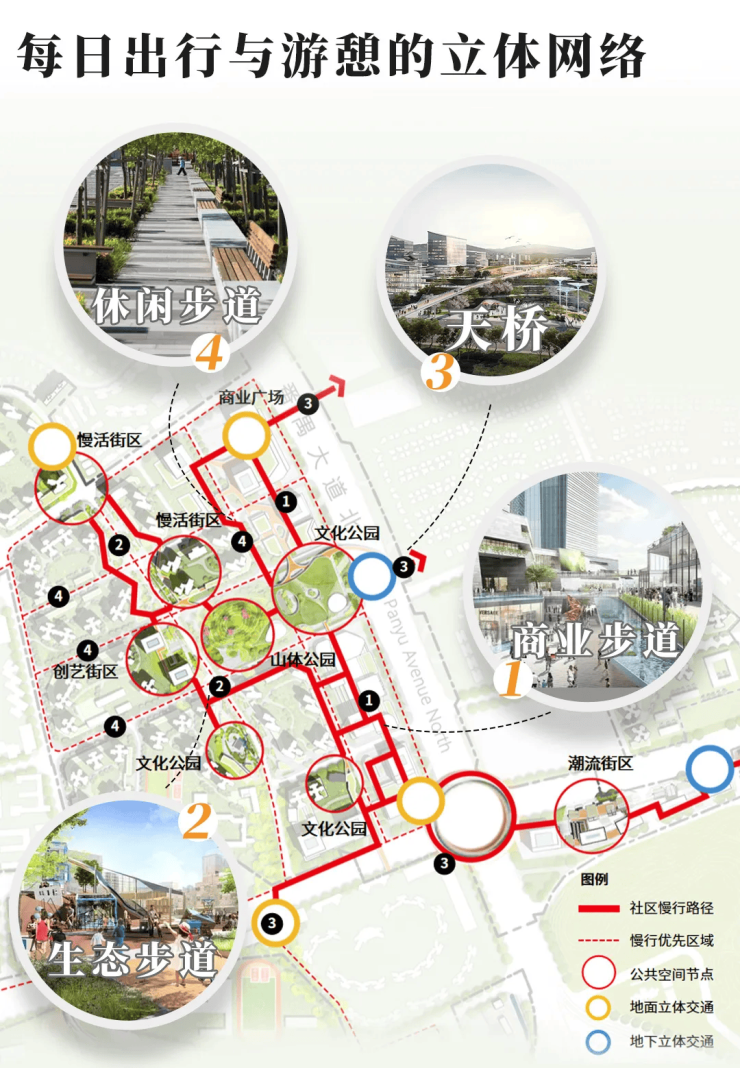 还通过“新链接”的思路,设计立体环廊系统、慢行步道、天桥等,以及开放式的设计,将各个空间节点有机串联起来,丝滑融通👇