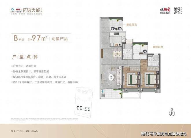 户型亮点:建面约98㎡三房,空间利用率达92%