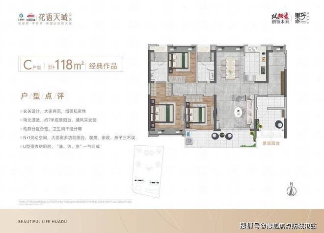 约118㎡3+1多功能空间,入户带玄关,增加居住私密性,兼顾居住舒适性与功能性的平衡,南北通透,约7米景观阳台连接客厅