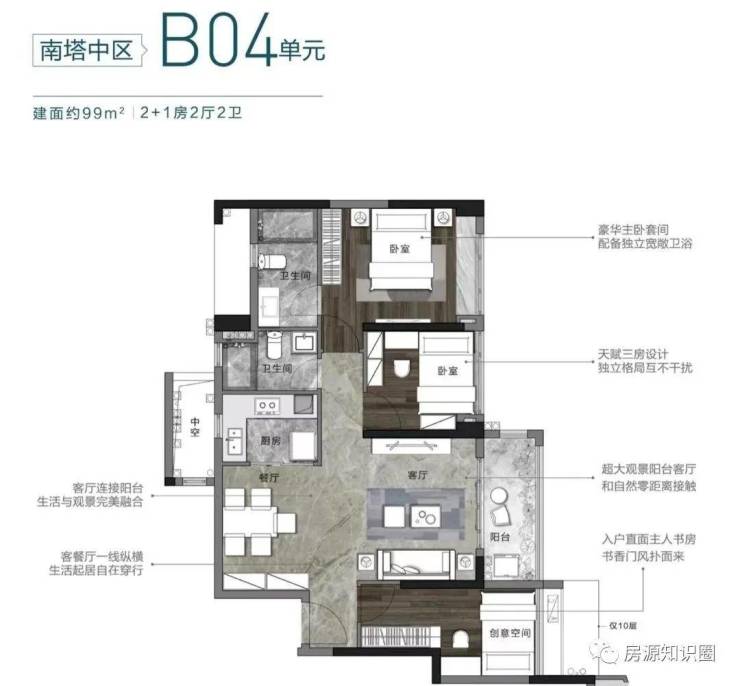 建面约99平2+1房,方正通透,足够多口之家同堂生活。户型带有豪华主套,拥有独立的卫浴,私密感更强,即使是出门前的“早高峰”也无需和家人产生使用冲突。还能在宽景阳台上摆上户外桌椅,沏上一壶清茶,享受难得的悠闲时光。