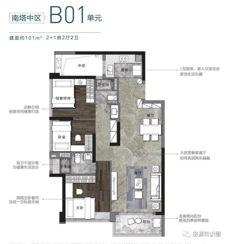 建面约101平2+1房,超大的餐客厅,联通南向大阳台,让你踏入的第一眼就能感受到大宅风范。而且户型设计了不少收纳空间,加上干湿分离的卫浴设计,引领全新时代的居住习惯。