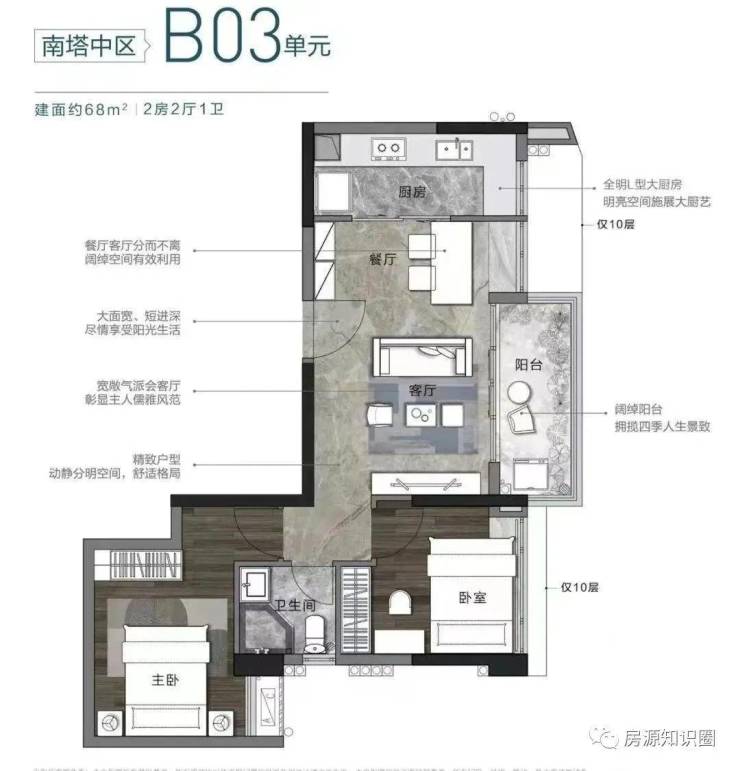 就目前流出的户型图来看,建面约68㎡两房两厅,采用横厅设计,动静分区明显。