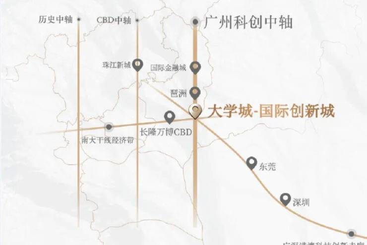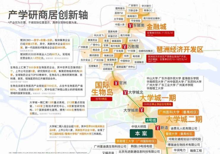 项目位于大学城二期-国际创新城板块,国际创新城共十平方公里,有暨南大学和广州医学院,整个创新城包括北翼的生物岛,核心的大学城和南翼的南岸起步区,南村地区,化龙地区,国际展贸城,在空间结构上形成了一核两翼。