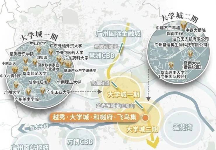 金光东隧道已经通车,5min直通大学城一期。同时也 让一二期资源得以链接、整合,真正融合成为一个整体。