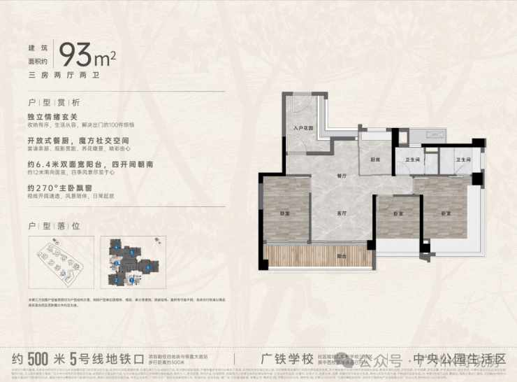 “中央公园”,紧邻大脚印公园,距离地铁约500米,紧邻学校、酒店,户型涵盖75-88㎡三房,105、125、142㎡四房。