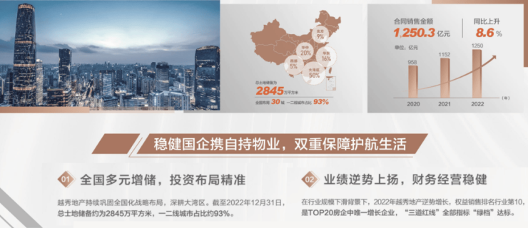 【2022年销售额1250.3亿,蝉联广州TOP1;2023年TOP20房企增长率第1,“三道红线"全部指标"绿档"达标。数据来源:克而瑞】越秀地产1983年成立,是中国第一代商品房缔造者41年长足发展,布局全国超30城,深得超100万业主的信赖
