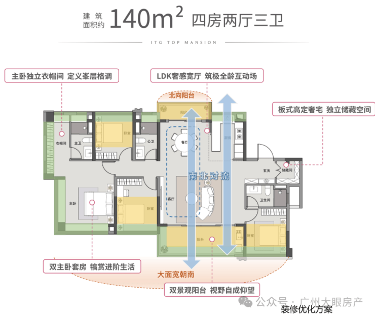 140平四房三卫,不超豪宅线做四房三卫,挺不错的。只在8#楼小高层,专梯入户。南北双阳台,格局和123平很像,可以看作125平户型的升级版。
