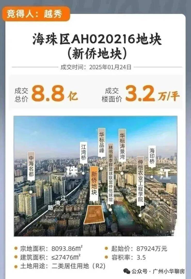 2025年1月24日,2025年广州首宗宅地---海珠滨江中AH020216地块,即江湾路以西地块,又称新侨地块,被越秀以底价近8.8亿的总价、3.2万/㎡的楼面价拿下。