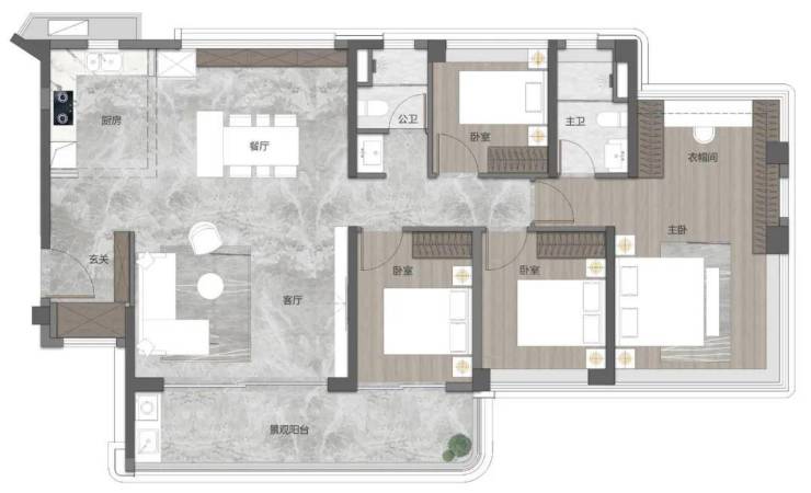 建面116平四房两卫,这个户型没有做板房,相当于138的缩小版,也是超宽阳台和客厅,主卧L型大飘窗,景观也比较好。