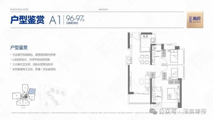 96㎡的3房2厅2卫,A1户型/2栋2单元02,设计的是竖厅格局,客厅3.5米开间,LDKB一体化,S墙设计预留冰箱卡槽位,动静分区,三开间朝南,双次卧东北向,得房率约78%(不含赠送),U型厨房,公卫三段式分离,东南朝向。