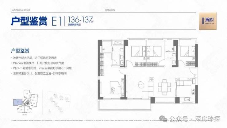 136-137㎡的4房2厅2卫,E1户型,设计的是横厅南北通透格局,客餐厅6.9米开间,LDKB一体化设计,四开间朝南,全屋7面飘窗,主卧套房+步入式衣帽间,3个次卧朝东北向,得房率约78%(不含赠送),U型厨房,公卫三段式干湿分离,客厅连接次卧出7.4米长的超大阳台,西南朝向。