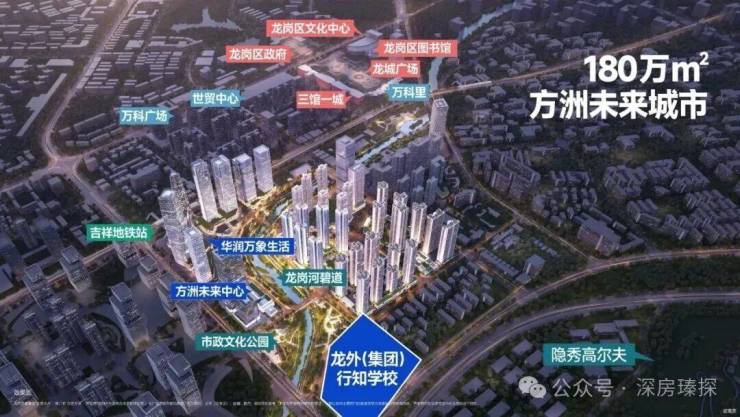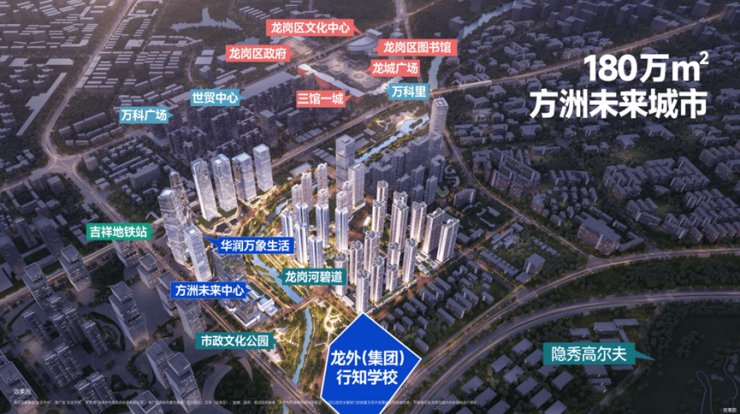 合正方洲在龙岗中心区、区政府的周边,云集了整个龙岗区的政务机构、商务集群、文化地标、教育资源与庞大商圈。