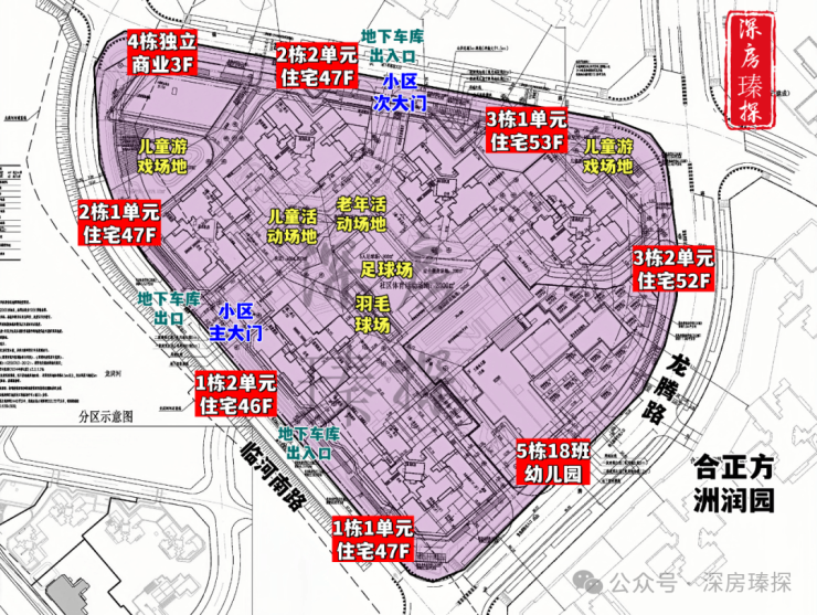 合正方洲瀚府,总占地面积约3.05万㎡,总建筑面积约27.4万㎡,计容建筑面积约20.11万㎡,容积率6.6,绿化率40.01%,共由6栋总高46-53层的住宅组成,其中1栋1单元/2栋1/2单元住宅47F,1栋2单元住宅46F,3栋1单元住宅53F,3栋2单元住宅52F,5栋是1所18班制幼儿园,园区内规划有多个儿童游戏场地,羽毛球场,足球场。