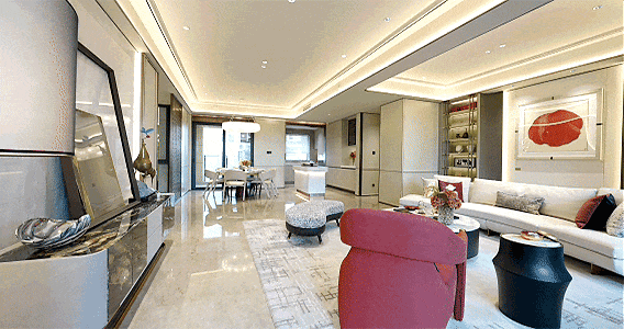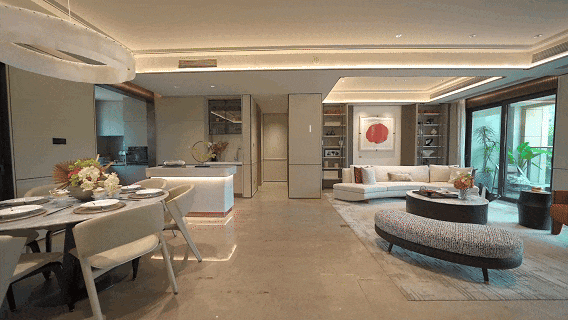 约3.15米层高,最大化扩大视野,营造开门见阔的明朗。约50㎡LDKG一体化宽厅承载家族欢聚的丰盈场景,三代之间的代际互动、亲密晚宴的谈笑风生,于此超尺度社交场域中美好上映。