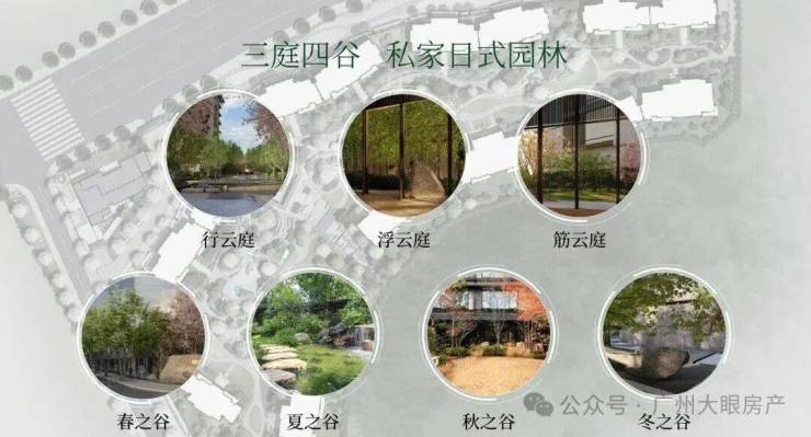 小区园林“四谷三庭”的空间布局,不像传统豪宅园林那样“扁平”,而是非常立体。在这里,项目借助砂、石、水、木等元素,营造山水庭院的禅意。搭配上樱花树等各种花期不同的树木,也算是把“四季”风景搬到小区楼下。