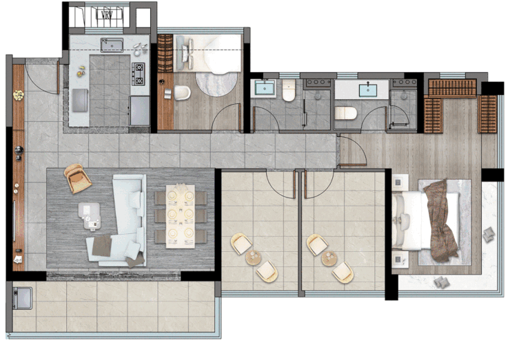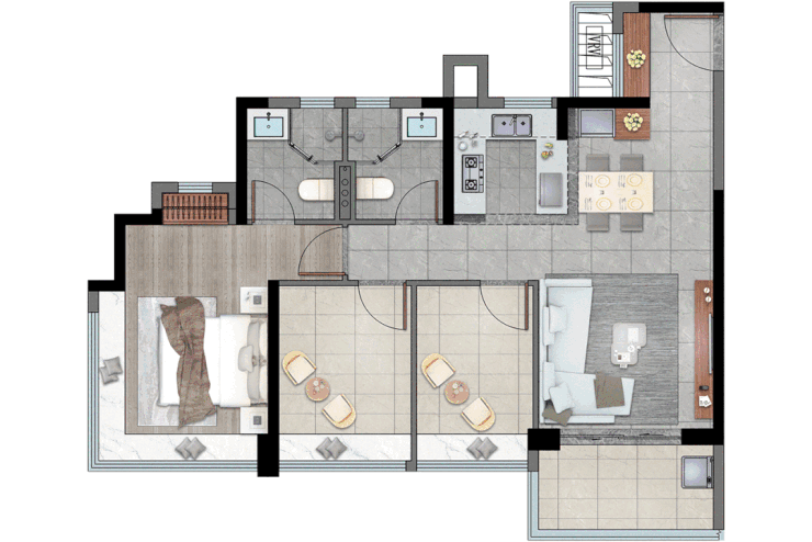 其中,主卧采用酒店式套房设计,且带有270°转角大飘窗,视野阔绰。