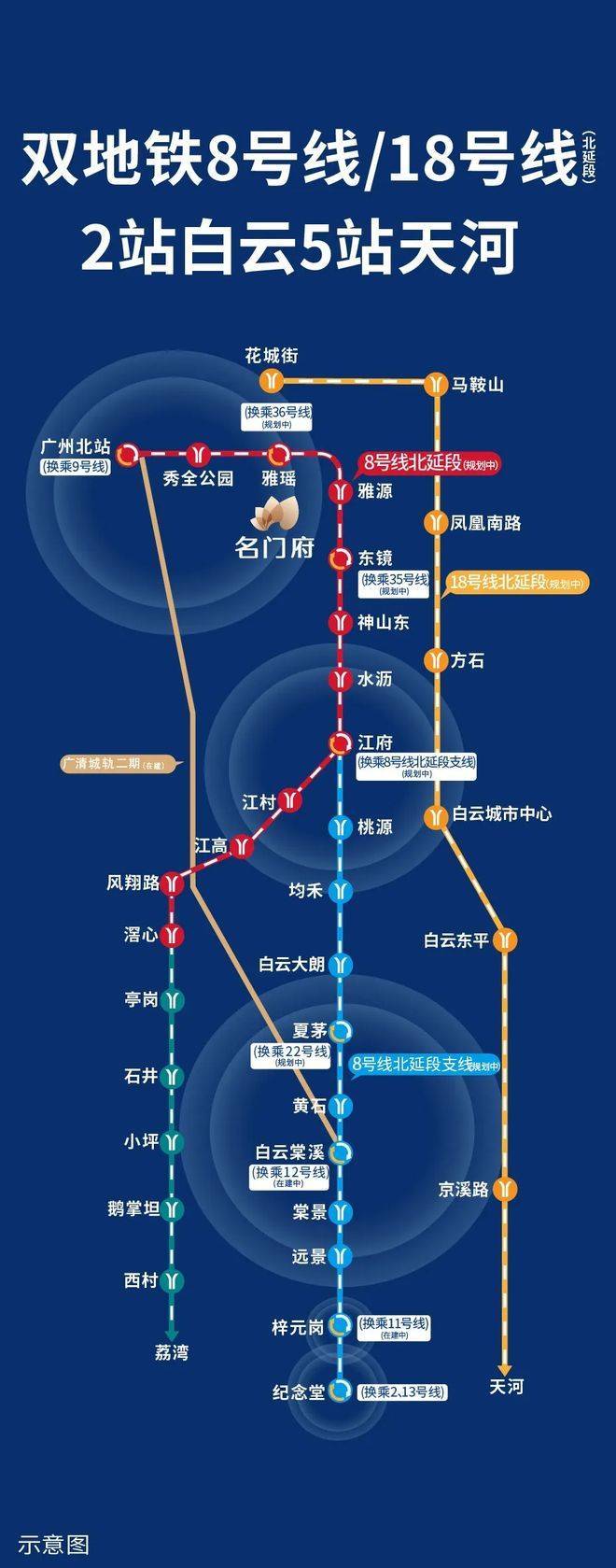 项目地处广花新城核心,西接广州北站、东临空港经济区、南望白云新城,享 “双枢纽 + 空港” 三重区位红利。交通上,距在建地铁 8 号线北延段雅源站约 500 米,2026 年开通后可快速换乘 18 号线(凤凰南路站约 2 公里);自驾走广花快速路(双向 8-10 车道,全程无红灯),20 分钟直达白云中心,1 小时覆盖广州核心区;小区内设公交首末站,日常出行便捷。周边商业氛围持续升级,500 米内规划 11 层高大型综合体,7 大商业广场环绕,3 公里内有 4A 级花都湖公园,生活与生态需求兼顾。