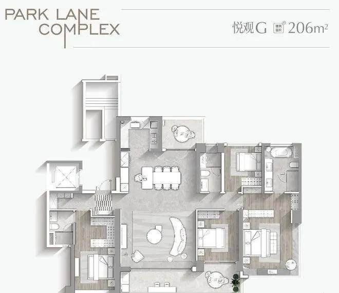 200平方米以上大平层:定位高端改善,如206平方米户型采用LDKG一体化设计,配备9.3米IMAX观景阳台及40平方米主卧套房,私密性与奢适度兼备。
