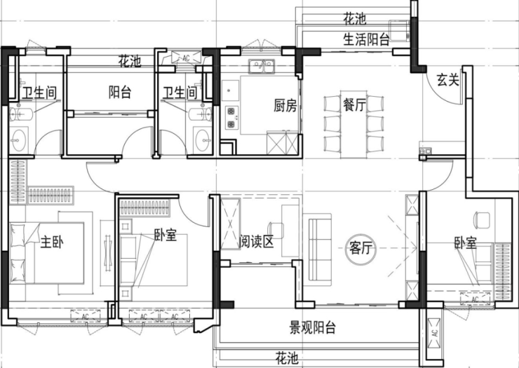 百变户型,阳台可并入次卧、阅读区可并入客厅,空间感更强;