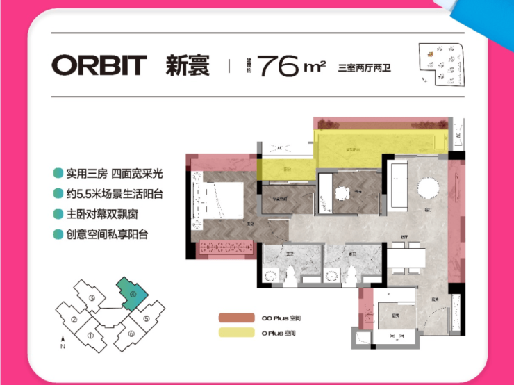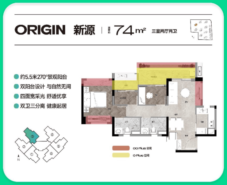 南北双阳台设计,通风对流效果佳且生活、观景两不误;景观阳台近6米长,提供充足的室外活动空间;