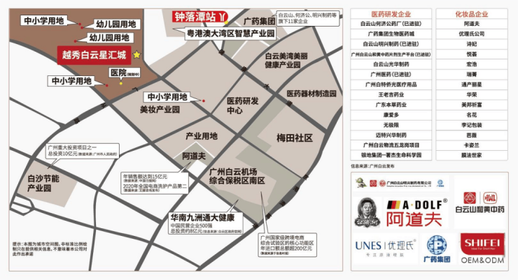 广州大健康产业基地:投资200亿,规模约等于22个广钢新城,已有何济公、明兴制、广药集团、和黄中药等29家知名健康产业企业入驻。健康城整体包含医药研制、职业教育、健康服务和健康养生四大功能片区。
