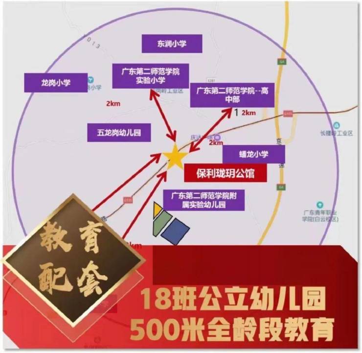 项目配建18班广二师幼儿园,现已开学,周边3公里内覆盖从幼儿园到大学全龄段教育,钟落潭小学(区一级)、蟠龙小学(区一级)、广州八十一中学(市一级)、广州大同中学(国家级示范性高。