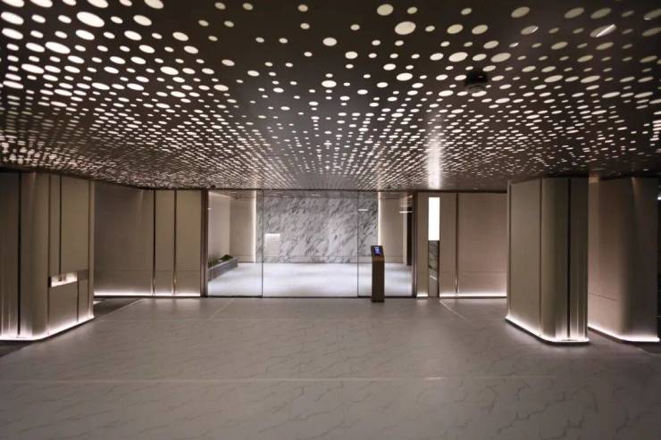 ➤大堂空间:深色地面搭配轻暖色墙面古铜色仿金属饰面吊顶