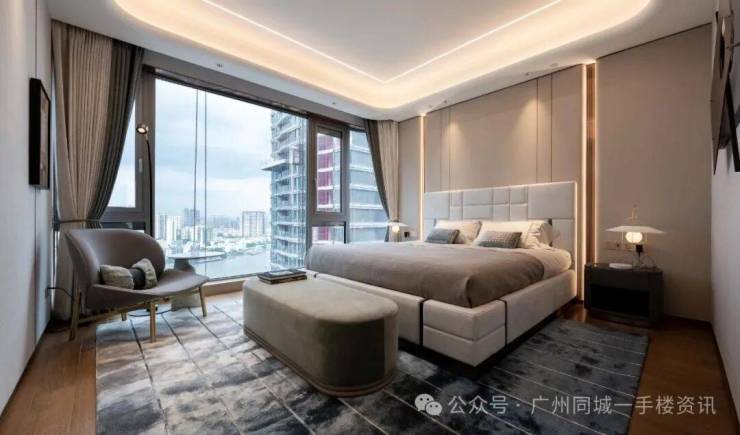 全面屏弧型转角落地窗,躺在床上,就能欣赏一幅铺开的江景长卷。