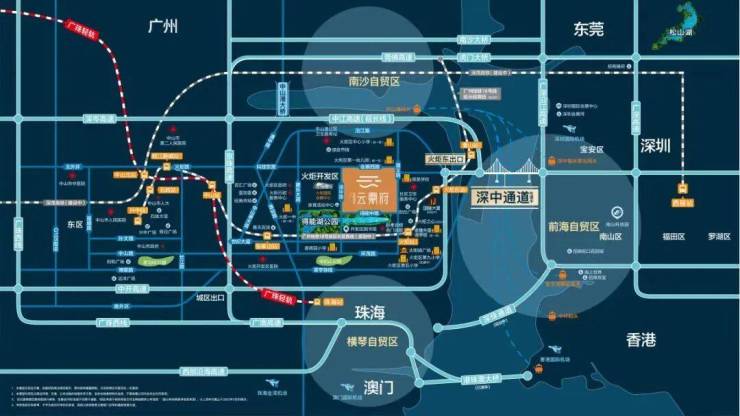 3轨道:约400米即达广州地铁18号线(南中城际)火炬站(在建)、广珠城际、深茂铁路(在建)