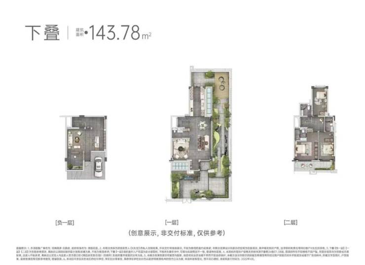 下叠143㎡户型,负一层贴心配备私人车库、健身区与影音室,满足您的日常休闲与娱乐需求。