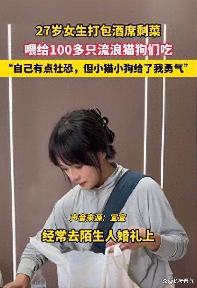 想到这个办法后,她就开始去婚宴打包剩菜了。宣宣本来有点害羞,但是为了猫咪们能吃饱,她就主动走到那些不认识的新人面前,然后说出自己的想法。通常呢,新人们都能理解她,也支持她。有的人甚至会很热情地请她坐下来一起吃。不过她都会很有礼貌地拒绝,但是她会在礼金簿上放个100块钱左右。她笑着说,这是“小猫小狗交的饭钱”。我觉得这个细节特别暖心,也体现了她对新人的尊重。