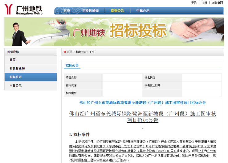 9月16日,佛穗莞城际广州段同步启动3个招标,包括施工图审核、规划测量、控制测量及施工测量检测工程项目。招标公告显示,线路已获得《广东省发展改革委关于新建佛山经广州至东莞城际铁路鹭洲至新塘段项目可行性研究报告的批复》,项目业主为广州地铁集团有限公司。