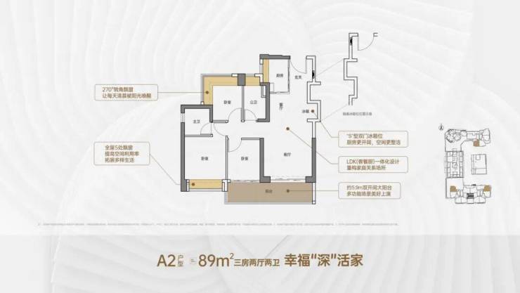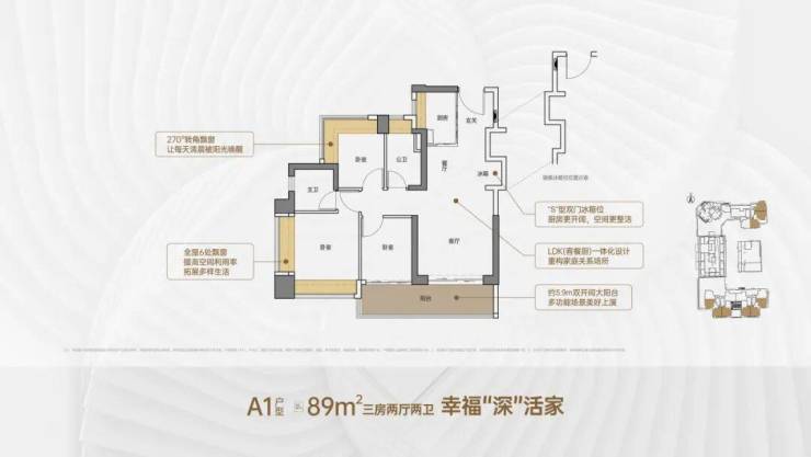 89㎡三房两卫(主力):竖厅格局、LDKB 一体化、约 5.9 米阔景阳台、主卧双面飘窗、次卧 270° 飘窗,总价 378 万起,入门优选