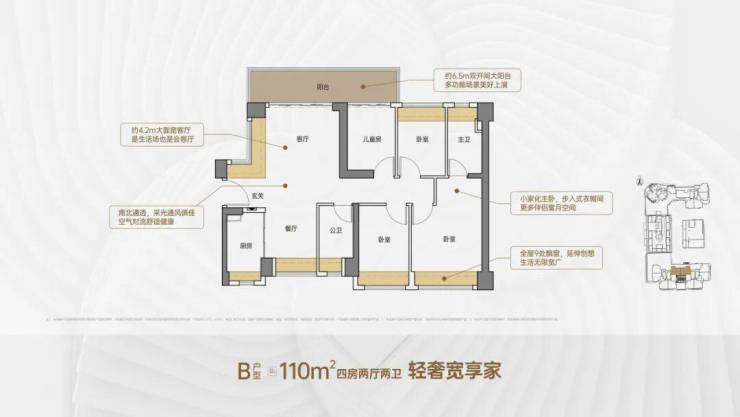 110㎡四房两卫:南北通透、竖厅设计、约 4.2 米客厅开间、6.5 米双开间阳台、多飘窗赠送,总价 543 万起,刚改首选