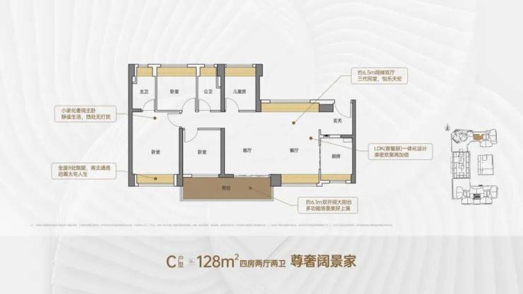 128㎡四房两卫:横厅 / 竖厅可选、南北通透、约 6.5 米阔绰横厅、四开间朝南、专享私密空间,总价 646 万起,改善优选